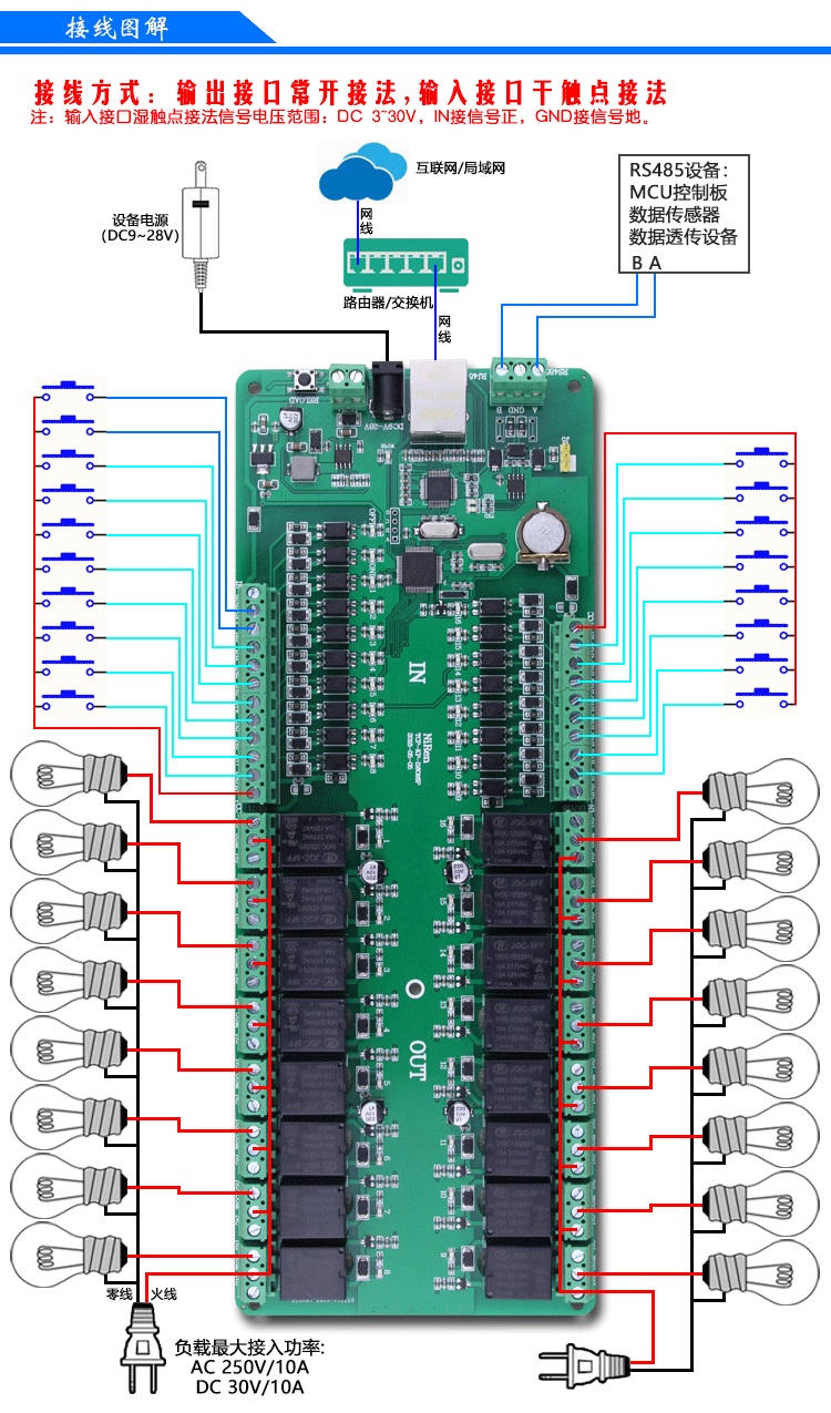 ??? 設(shè)備采用工業(yè)級(jí)設(shè)計(jì)方案,搭載32 ARM 處理器和10/100M 以太網(wǎng)網(wǎng)絡(luò)方案,具有速度快,運(yùn)算能力強(qiáng),穩(wěn)定性高,抗干擾能力強(qiáng)等特點(diǎn),滿足工業(yè)環(huán)境使用要求。設(shè)備有16 路繼電器輸出、18 路開關(guān)量隔離輸入和1 RS485 接口,繼電器支持實(shí)時(shí)控制、延時(shí)控制、輸入輸出聯(lián)動(dòng)控制、一鍵全開全關(guān)控制、日循環(huán)定時(shí)控制和自定義日期控制等多種控制方式,開關(guān)量輸入狀態(tài)支持被動(dòng)上傳、定時(shí)上傳和觸發(fā)上傳,RS485 接口支持用于控制設(shè)備或傳輸數(shù)據(jù),以滿足更多不同的場(chǎng)合使用,滿足更多用戶的使用需求。