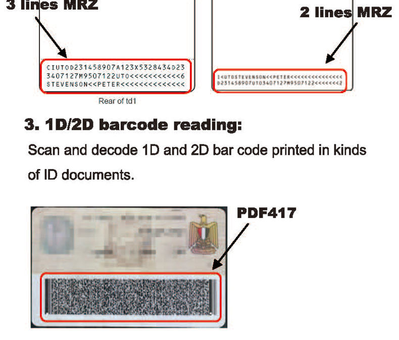 ? ICAO 9303 compliant 2 and 3 line MRZ ? 1D bar codes |