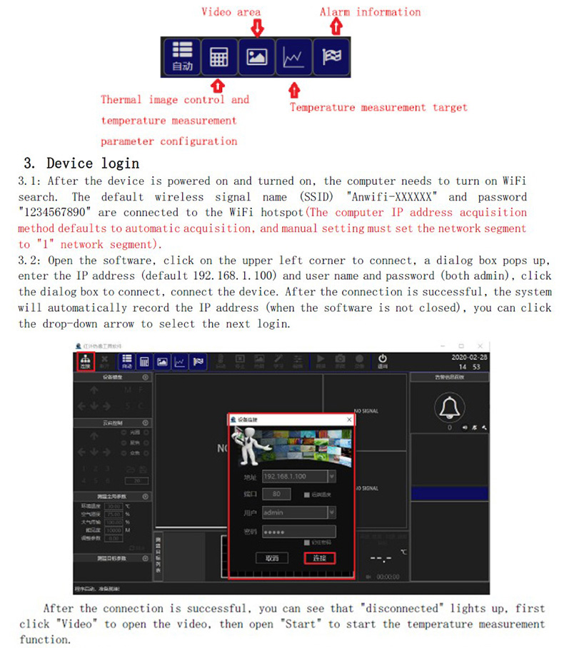 安裝好設備后,接通電源給設備上電,設備使用DC12V電源,用網(wǎng)絡和電腦連接,如果設備帶前端測溫功能(參數(shù)配置還需要測溫軟件配置),則可以連接到監(jiān)視器監(jiān)控。在電腦上打開測溫軟件,連接設備,默認IP地址為192.168.1.100。注意電腦IP地址需要在同一個網(wǎng)段。