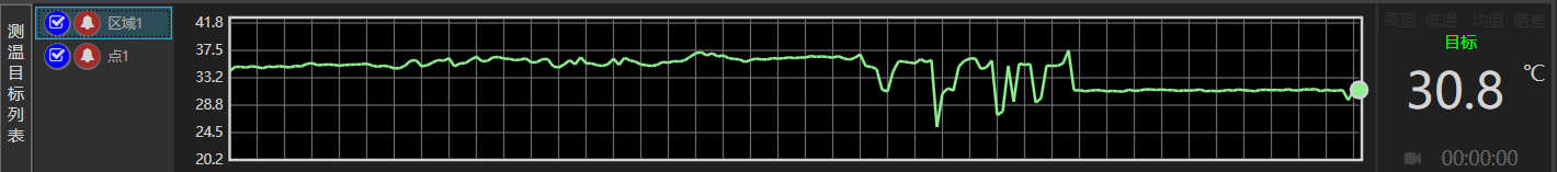 軟件具有告警布防功能,默認打開,在軟件下方測溫目標列表,可以配置設置的區(qū)域的布防開關,還可以顯示和隱藏熱像視頻中設置的測溫點和區(qū)域。選中某個區(qū)域,下方可顯示該區(qū)域的最高溫及統(tǒng)計曲線。