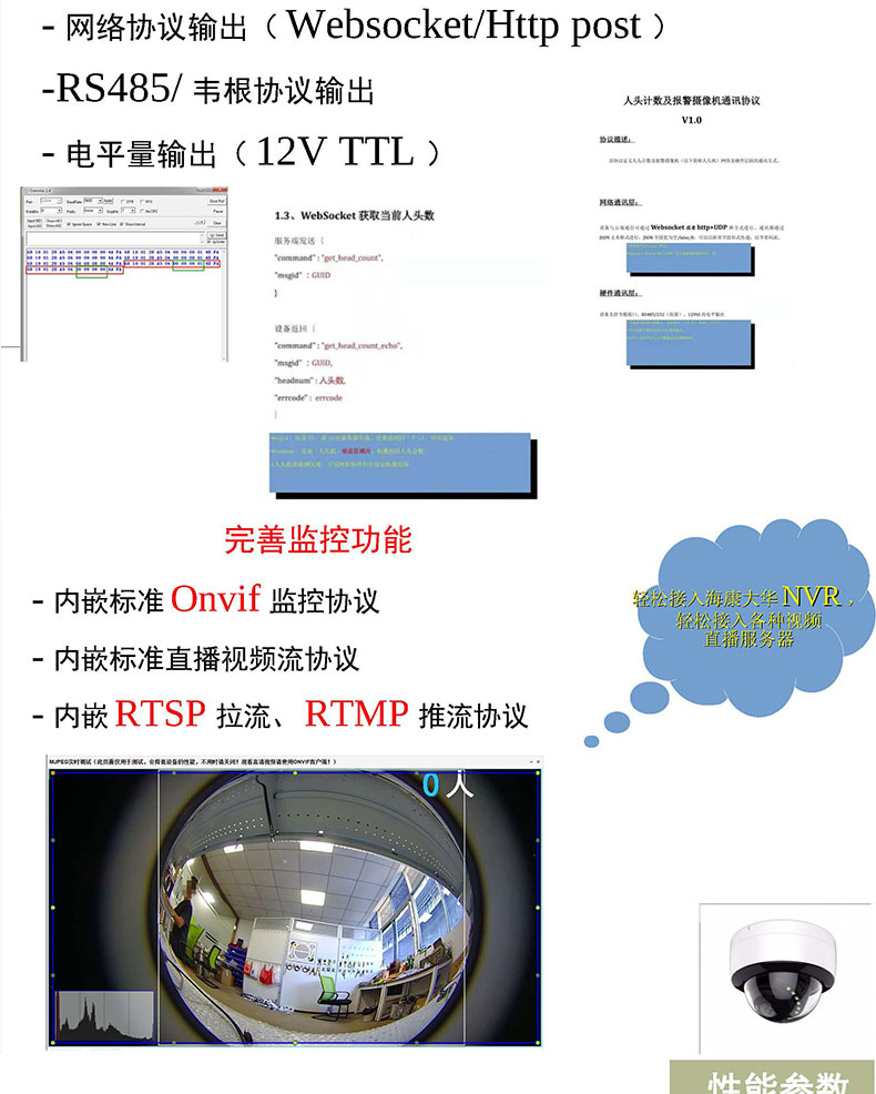 智能AI攝像機采用領先的視覺技術(shù),獲取目標的深度信息,結(jié)合智能跟蹤算法分析行人的行為軌跡,對計數(shù)區(qū)域進行分塊處理,計算各區(qū)塊邊界線上人員通行的方向及人數(shù),實現(xiàn)高精度的客流統(tǒng)計效果;廣泛應用到商場超市景區(qū)客站臨時活動等場所用來智能監(jiān)控;客流人數(shù)統(tǒng)計及軌跡跟蹤。攝像機是把光學圖像信號轉(zhuǎn)變?yōu)殡娦盘枺员阌诖鎯蛘邆鬏數(shù)囊环N機器。當我們拍攝一個物體時,此物體上反射的光被攝像機鏡頭收集,使其聚焦在攝像器件的受光面上,再通過攝像器件把光轉(zhuǎn)變?yōu)殡娔?,即得到了“視頻信號”,有的公交車上通過安裝攝像機來拍攝記錄上下車的行人,再通過車載設備統(tǒng)計實時經(jīng)過攝像機的客流量,因此攝像機是客流量統(tǒng)計系統(tǒng)中的重要一個部件。傳統(tǒng)的攝像機一般安裝在公交車車廂內(nèi)部的車頂,由于每個公交車的內(nèi)飾有區(qū)別,有的攝像機可以直接安裝在車廂內(nèi)壁,有的只能采用懸掛的方式進行安裝,因此不同的車輛需要搭配不同的攝像機使用,攝像機的安裝適用范圍較窄,雖然有的攝像機內(nèi)部安裝減震結(jié)構(gòu)防止攝像機抖動,傳統(tǒng)的減震結(jié)構(gòu)一般采用彈簧或者橡膠墊減震,使用一段時間后彈簧容易變形或者橡膠墊易老化,導致減震效果變差。